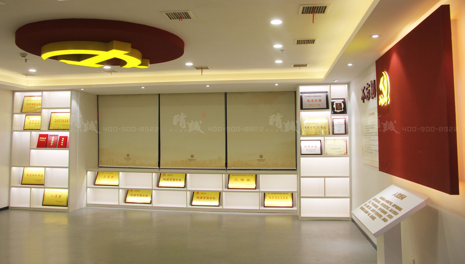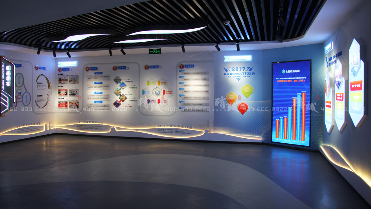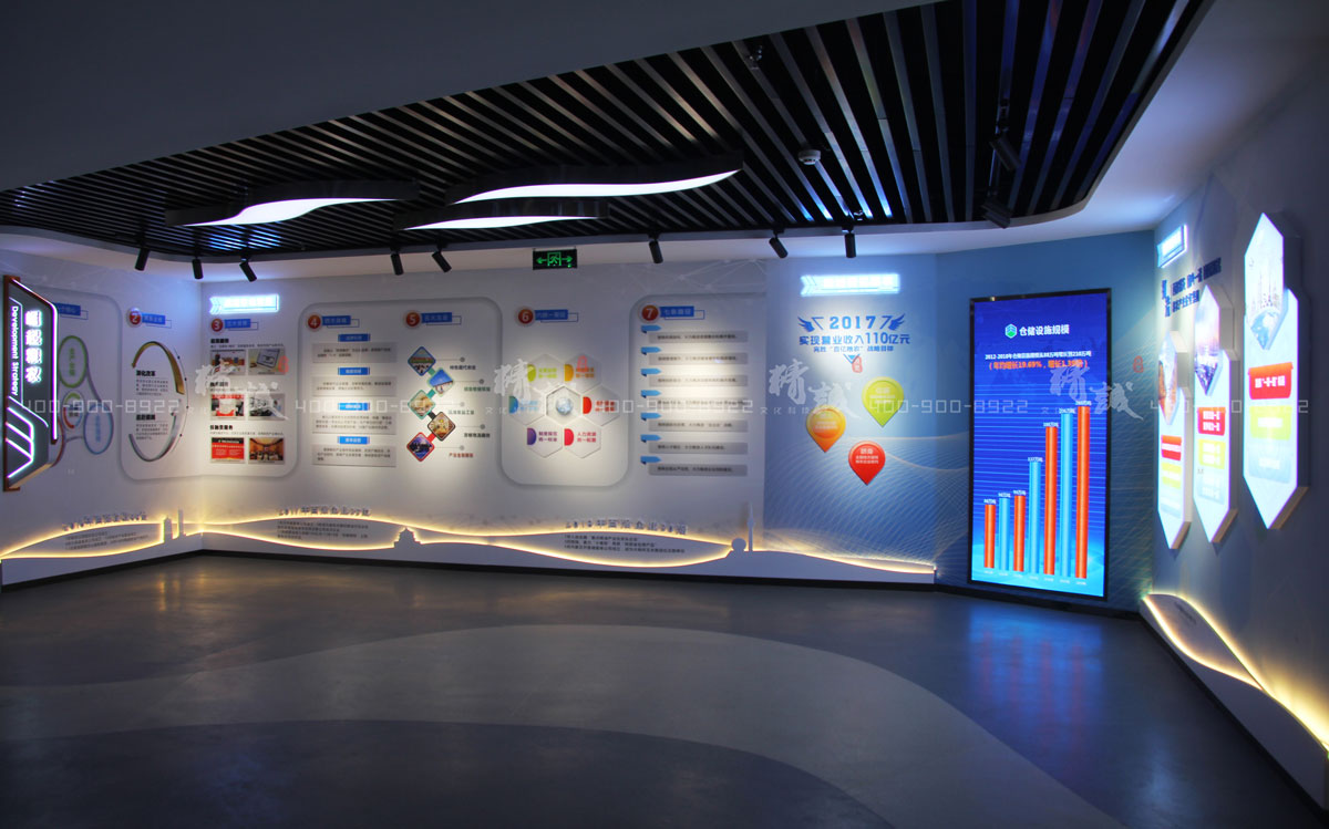該板塊采用墻面圖文展板+多媒體顯示屏,并結合細節(jié)化背發(fā)光式場景墻面裝飾,以頂墻地三面結合的畫面形式,對集團的發(fā)展、榮譽進行展示,達到視覺的豐富感和連貫性。