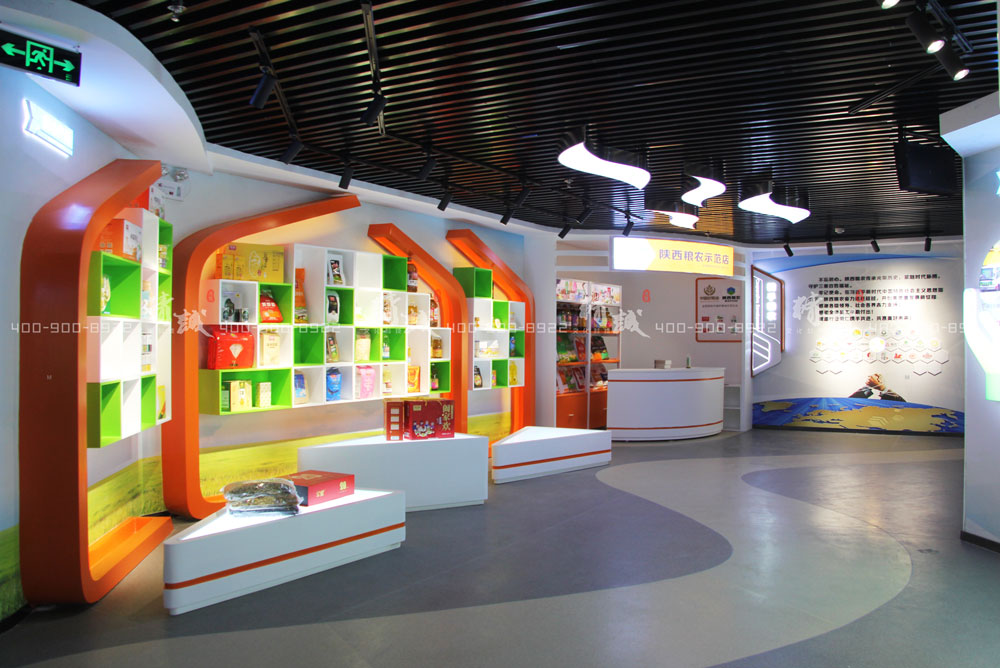 糧倉造型,獨具匠心的產(chǎn)品展架設計,陳列糧農(nóng)產(chǎn)品,配合展示糧農(nóng)集團服務體系。微縮示范店,線上體驗,線下銷售的體驗,及實體售貨柜陳列。