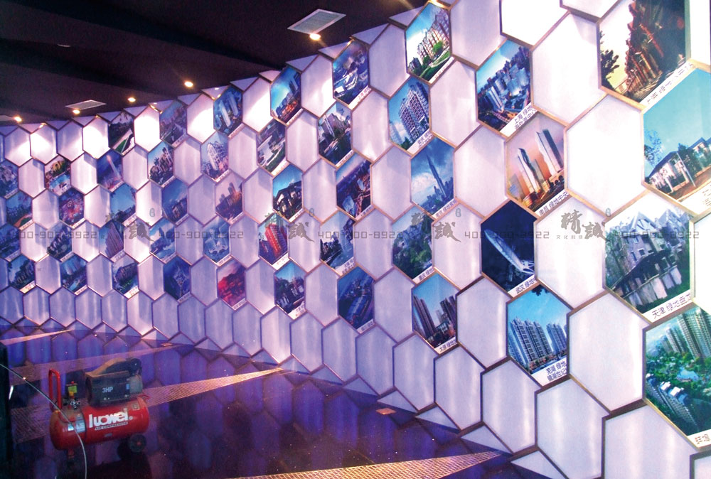 利用蜂巢狀的陣列造型,讓墻面顯得更加自然、原生態(tài),生動(dòng)又有趣。而藍(lán)色燈光恰到好處的運(yùn)用讓展廳在視覺(jué)效果上更加富有科技感。