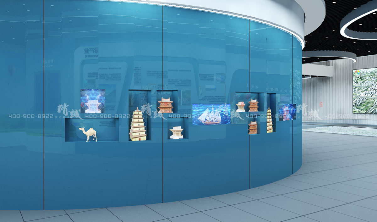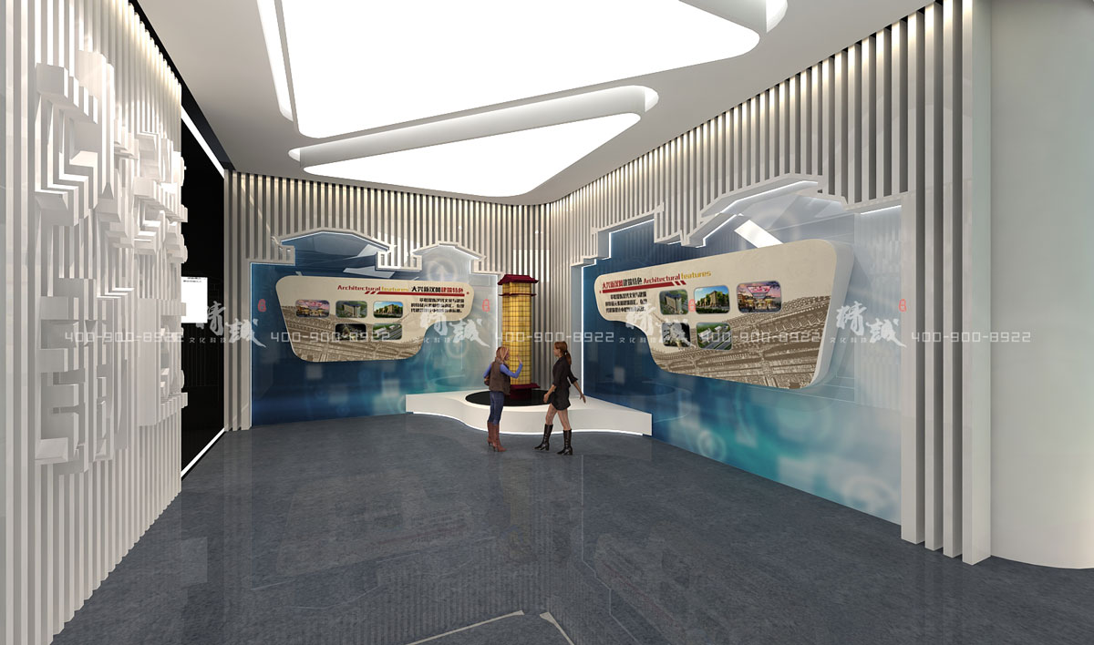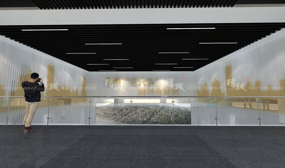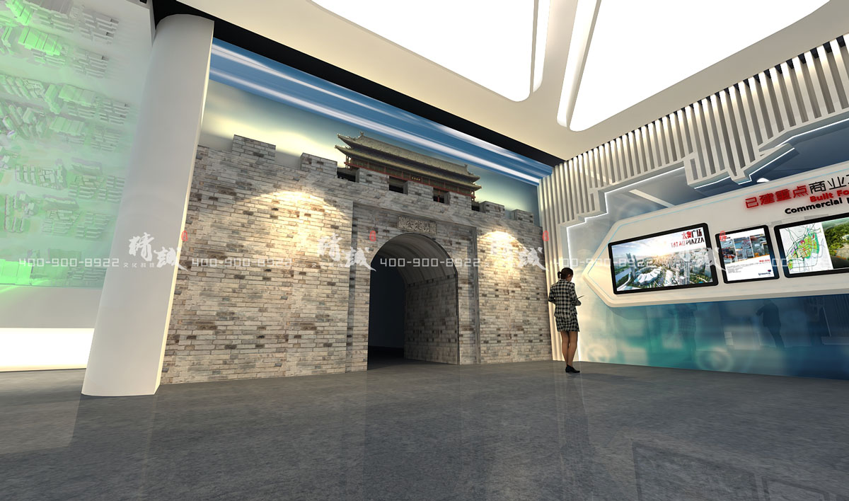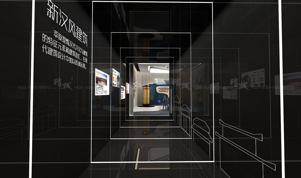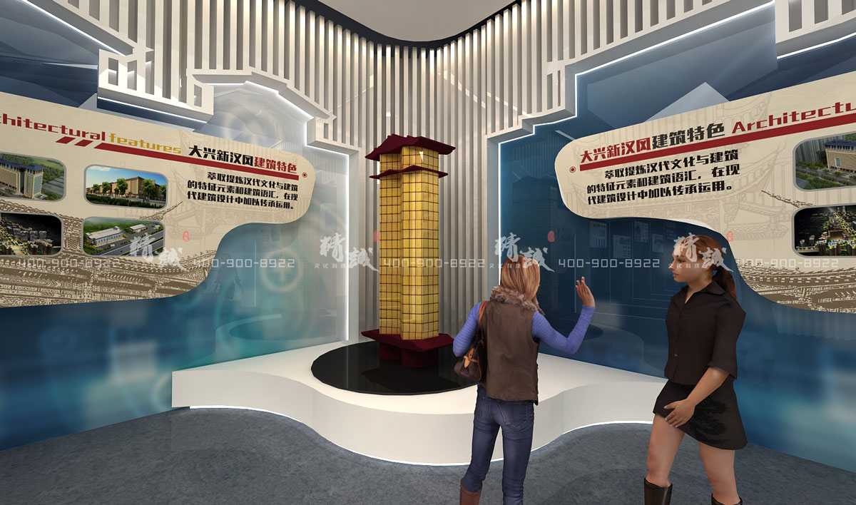 展墻用不同風(fēng)格的漢風(fēng)建筑剪影烘托環(huán)境,下方設(shè)置實(shí)體大興新區(qū)特色樓體模型,樓梯內(nèi)發(fā)光,下方加入旋轉(zhuǎn)地臺360度旋轉(zhuǎn),全方位立體化展示建筑特色。