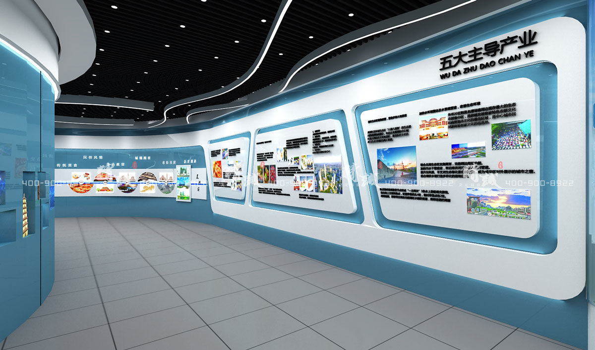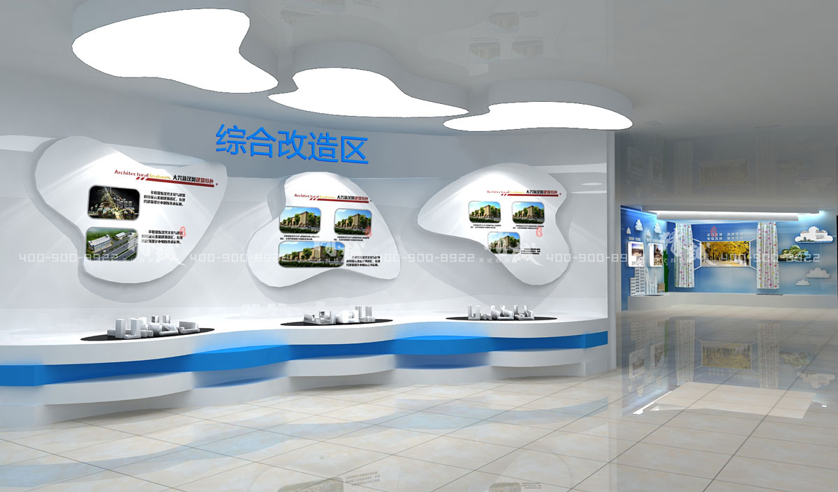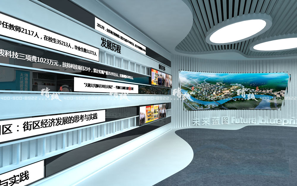 用建筑上常用的“工字鋼”造型來展示發(fā)展歷程和領(lǐng)導(dǎo)關(guān)懷板塊,在現(xiàn)代化的展陳設(shè)計(jì)中融入建設(shè)的概念,形成不斷發(fā)展的內(nèi)涵,.后,通過視頻專題作為展廳結(jié)尾,描繪未來蓮湖發(fā)展藍(lán)圖。