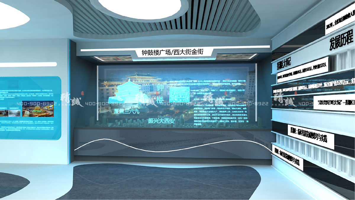 通過幻影成像技術(shù)展示鐘鼓樓廣場和西大街影像畫卷,動態(tài)的行人和車流,結(jié)合逼真的街區(qū)建筑,打造一副生機(jī)勃勃的繁華景象。