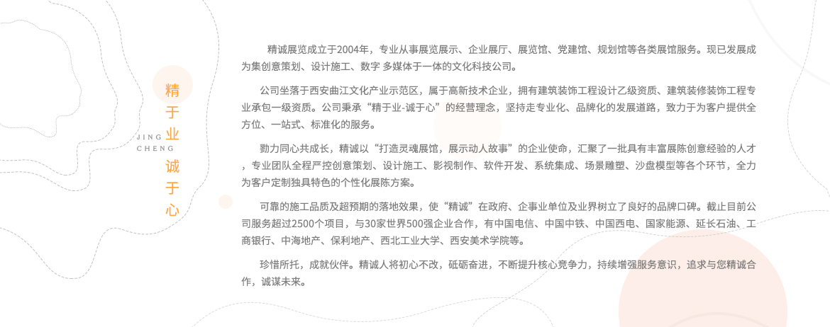 勠力同心共成長,精誠以“打造靈魂展館,展示動人故事”的企業(yè)使命,匯聚了一批具有豐富展陳創(chuàng)意經(jīng)驗的人才,專業(yè)團(tuán)隊全程嚴(yán)控創(chuàng)意策劃、設(shè)計施工、影視制作、軟件開發(fā)、系統(tǒng)集成、場景雕塑、沙盤模型等各個環(huán)節(jié),全力為客戶定制獨具特色的個性化展陳方案。