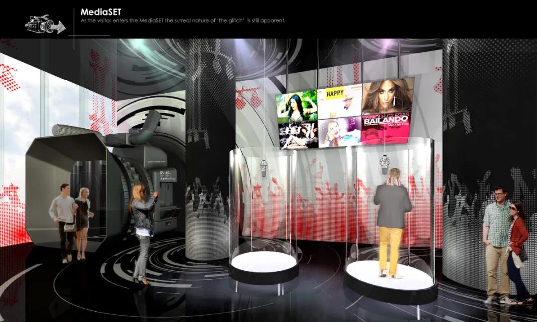 媒體集當(dāng)參觀者進(jìn)入MediaSET時(shí),“故障”的超現(xiàn)實(shí)性質(zhì)仍然很明顯。