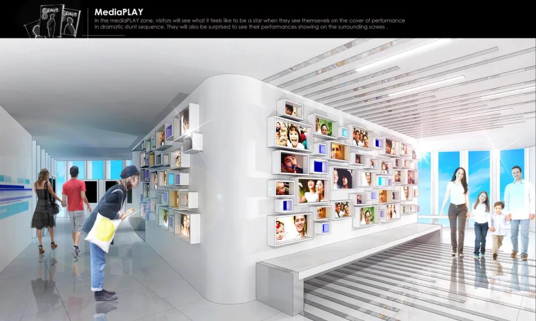 媒體播放區(qū):在“媒體播放區(qū)”,游客們會(huì)看到自己出現(xiàn)在《表演與特技》的封面上時(shí),感覺就像一個(gè)明星,他們也會(huì)驚訝地看到他們的表演在周圍的屏幕上。