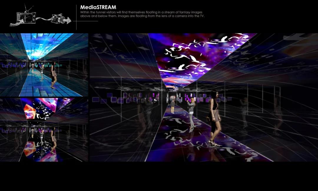 媒體流在隧道里,游客們會(huì)發(fā)現(xiàn)自己漂浮在他們上面和下面的一系列幻想圖像中。影像從照相機(jī)的鏡頭浮到電視上。