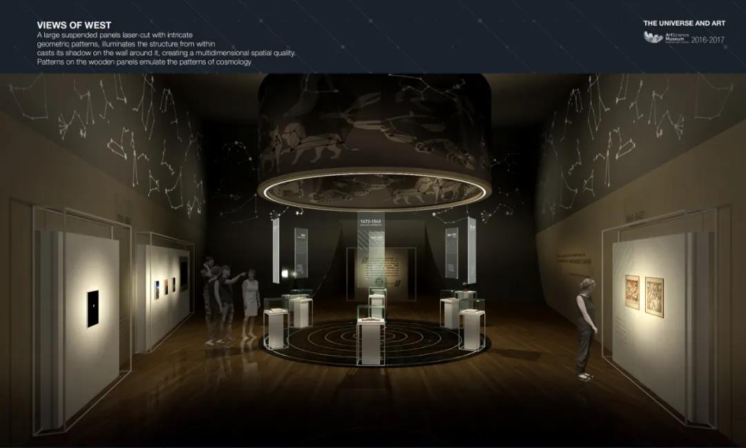 第一個(gè)要探索的主題是很久以前對宇宙的看法。參觀者被歡迎進(jìn)入一個(gè)由mandalas的圖畫創(chuàng)造的宇宙舞臺(tái),在展廳的中心焦點(diǎn)周圍的星座。