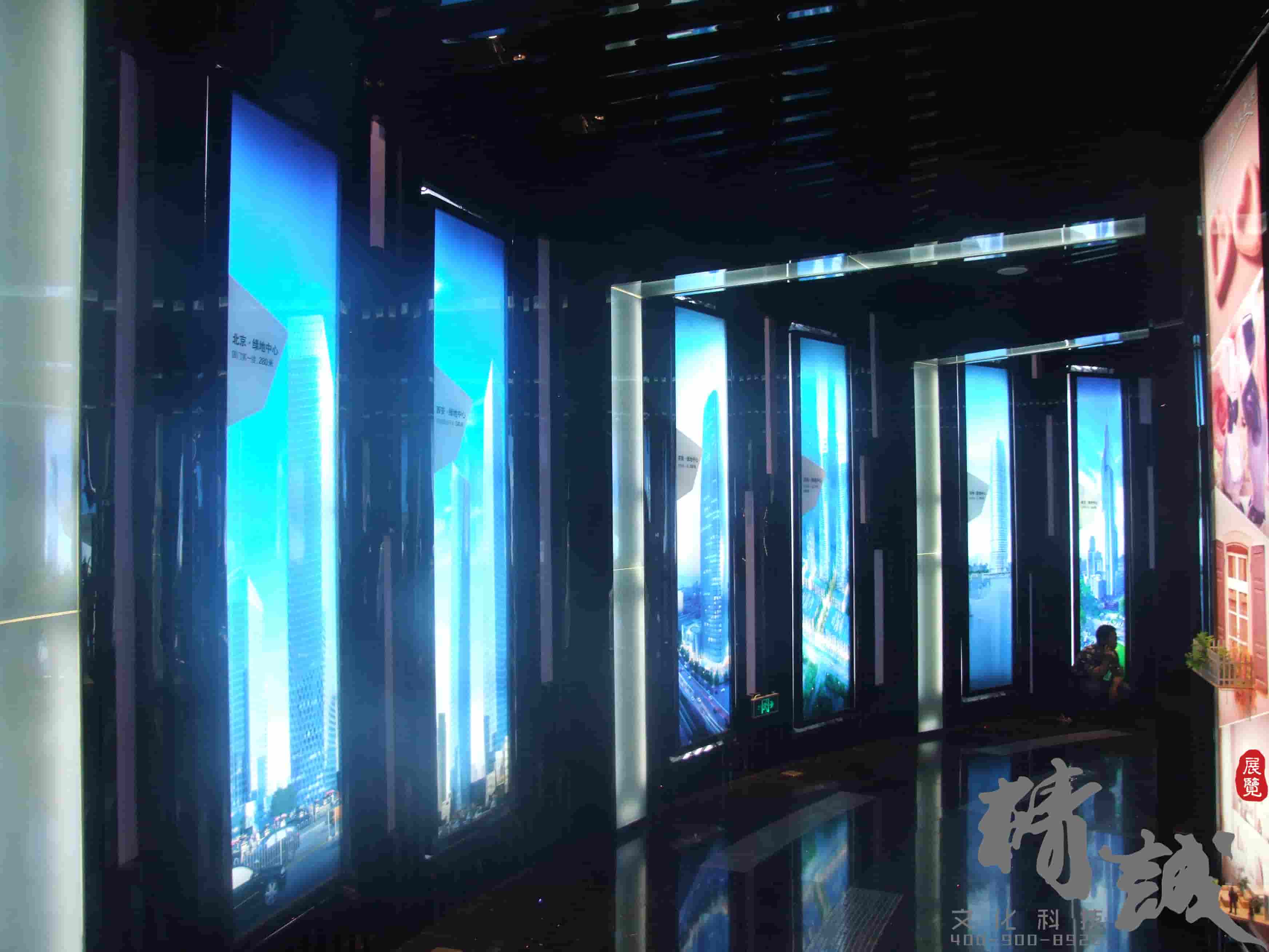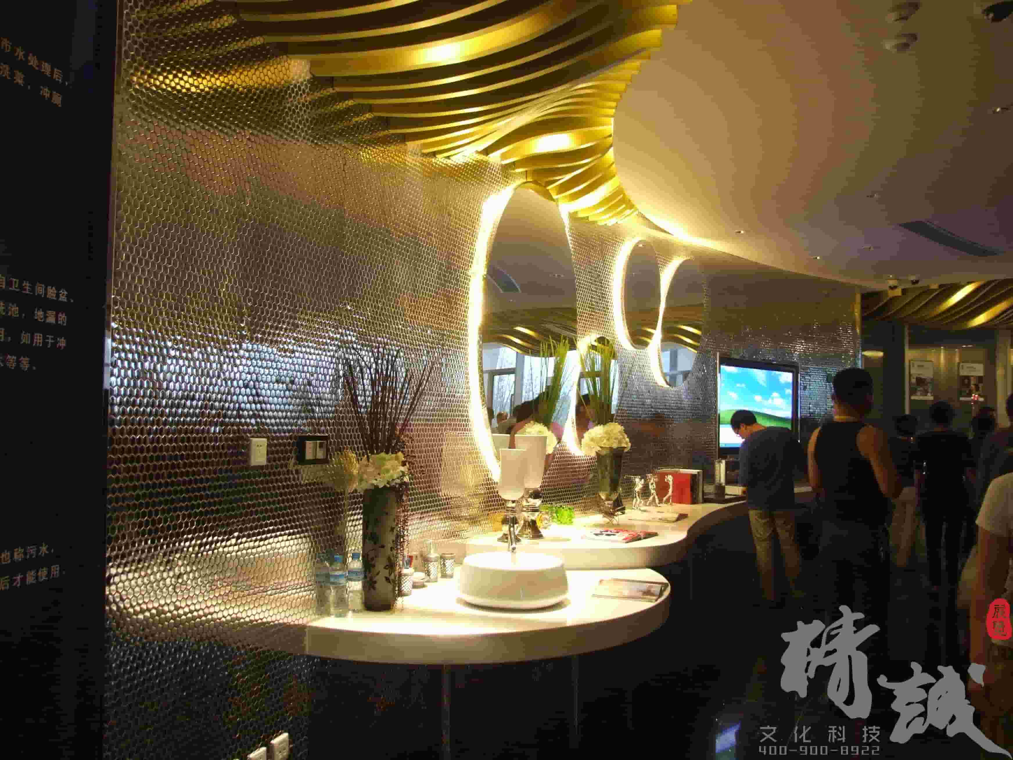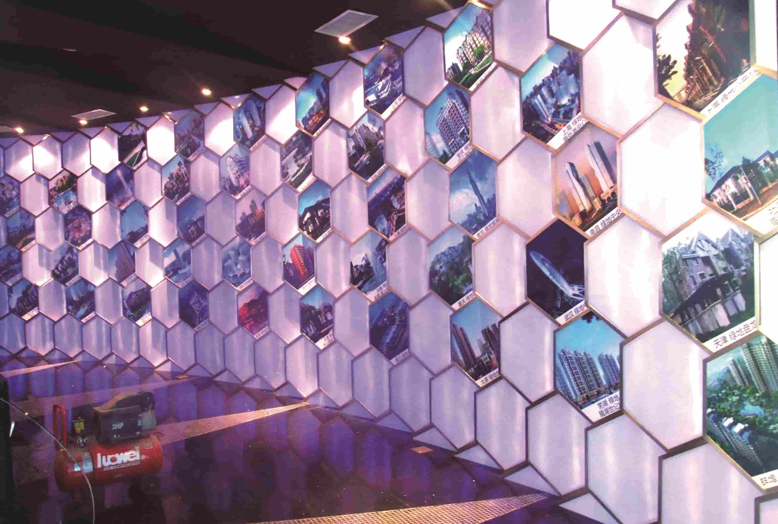 并且這個主要利用在現(xiàn)代裝飾風格中融入生態(tài)元素,突顯生態(tài)館理念。區(qū)別于常規(guī)整體墻面造型,利用高低錯落有序的獨立墻體設(shè)計,使整個弧形墻面更加富有層次感;利用蜂巢狀的陣列造型,讓墻面顯得更加自然、生動。而藍色燈光的合理運用,讓展廳在視覺效果上更加富有科技感。