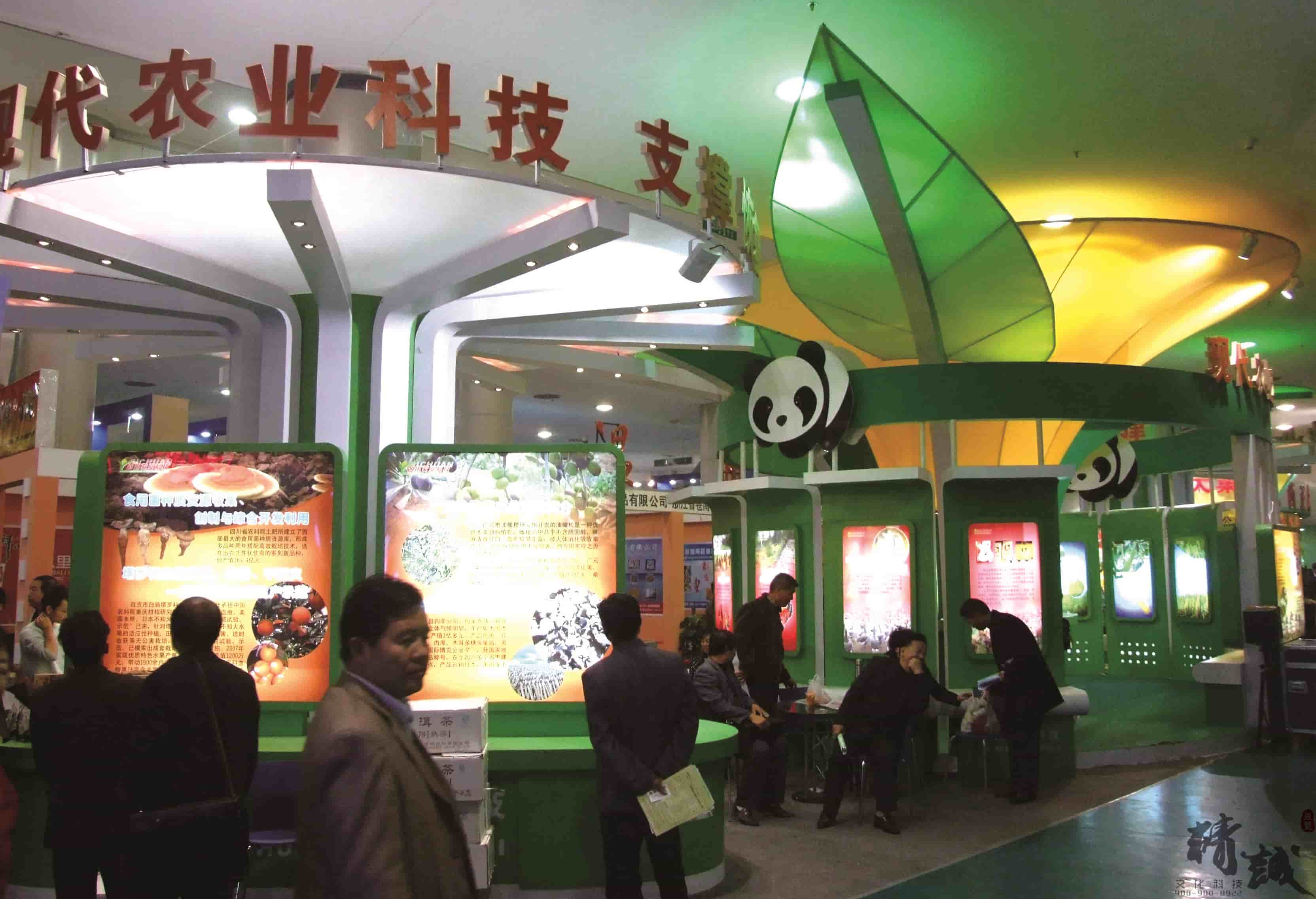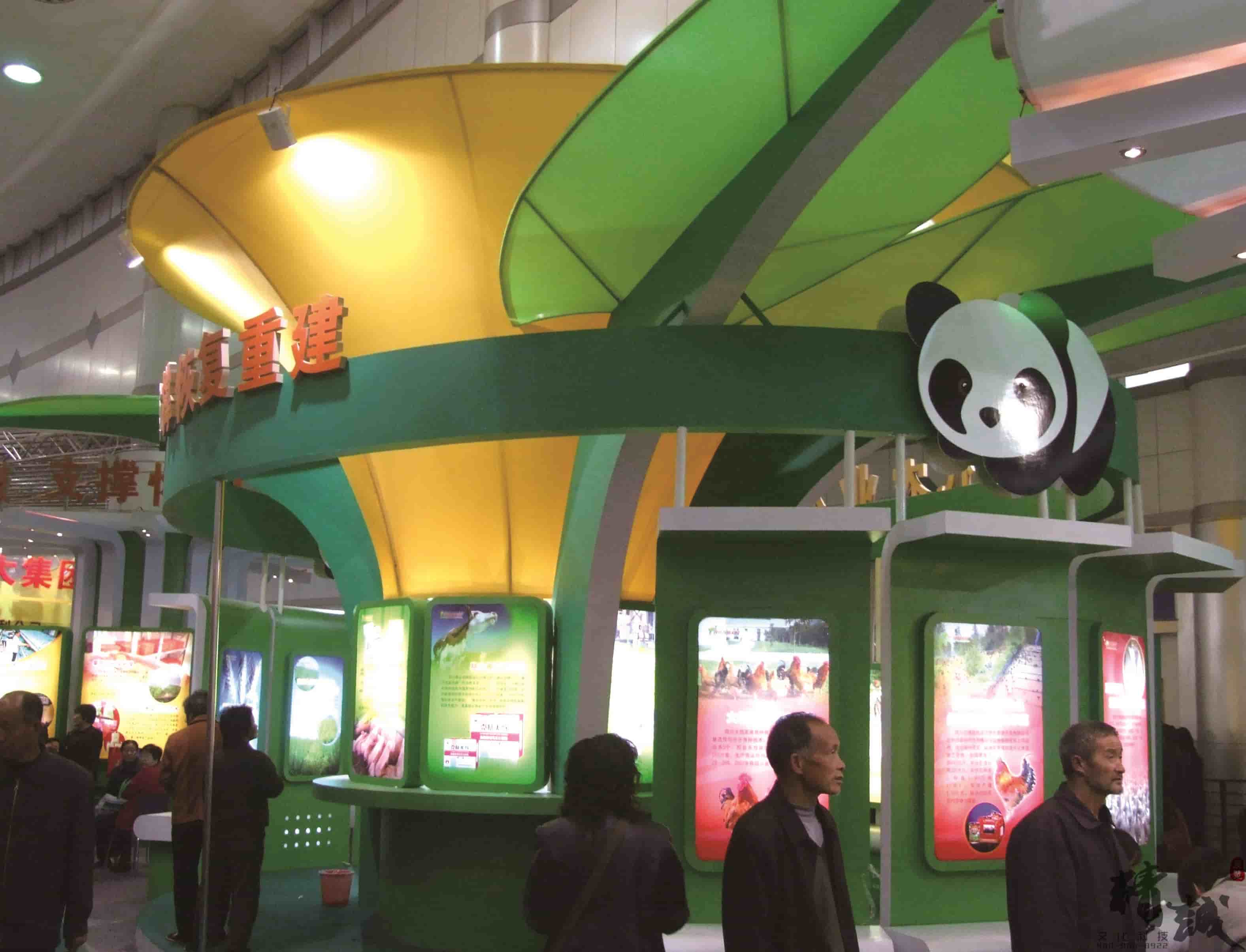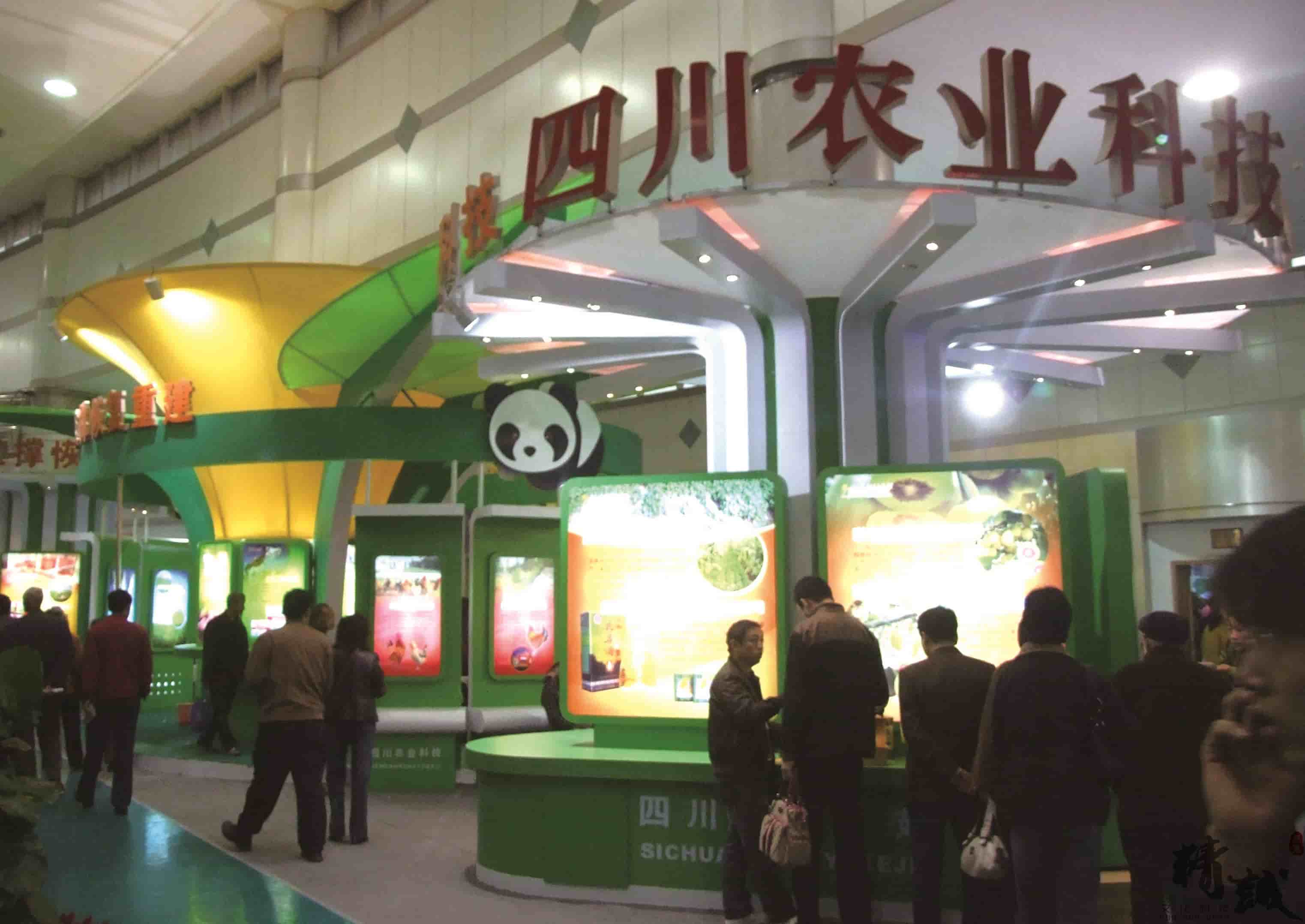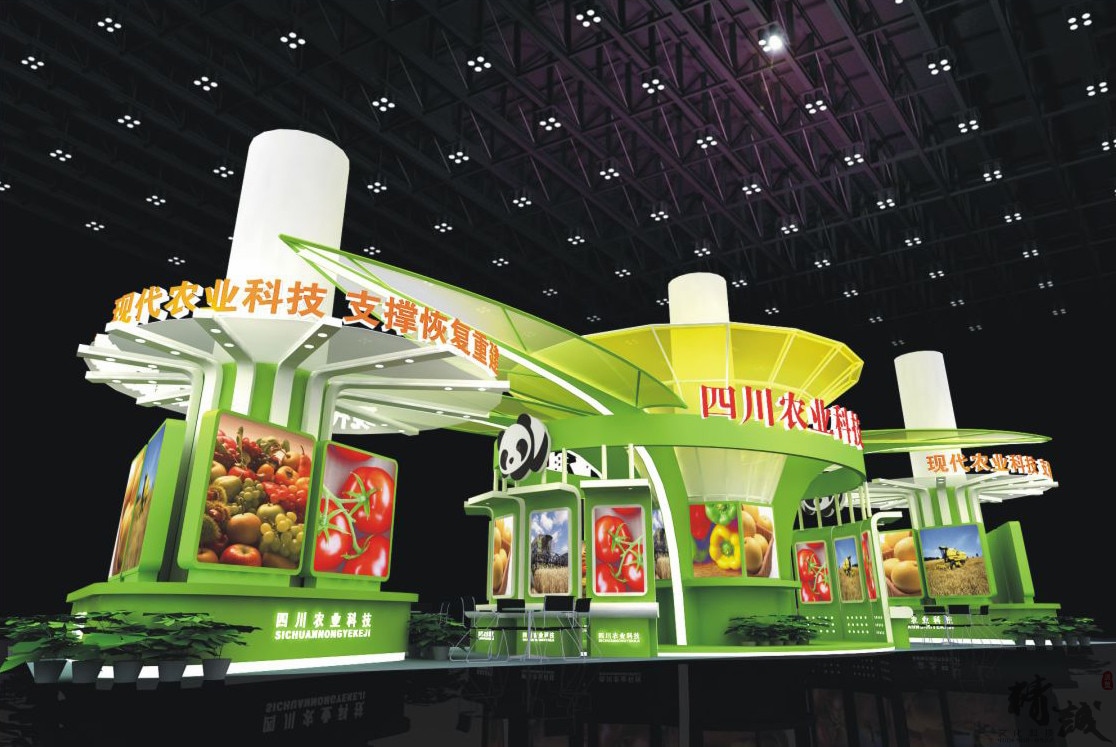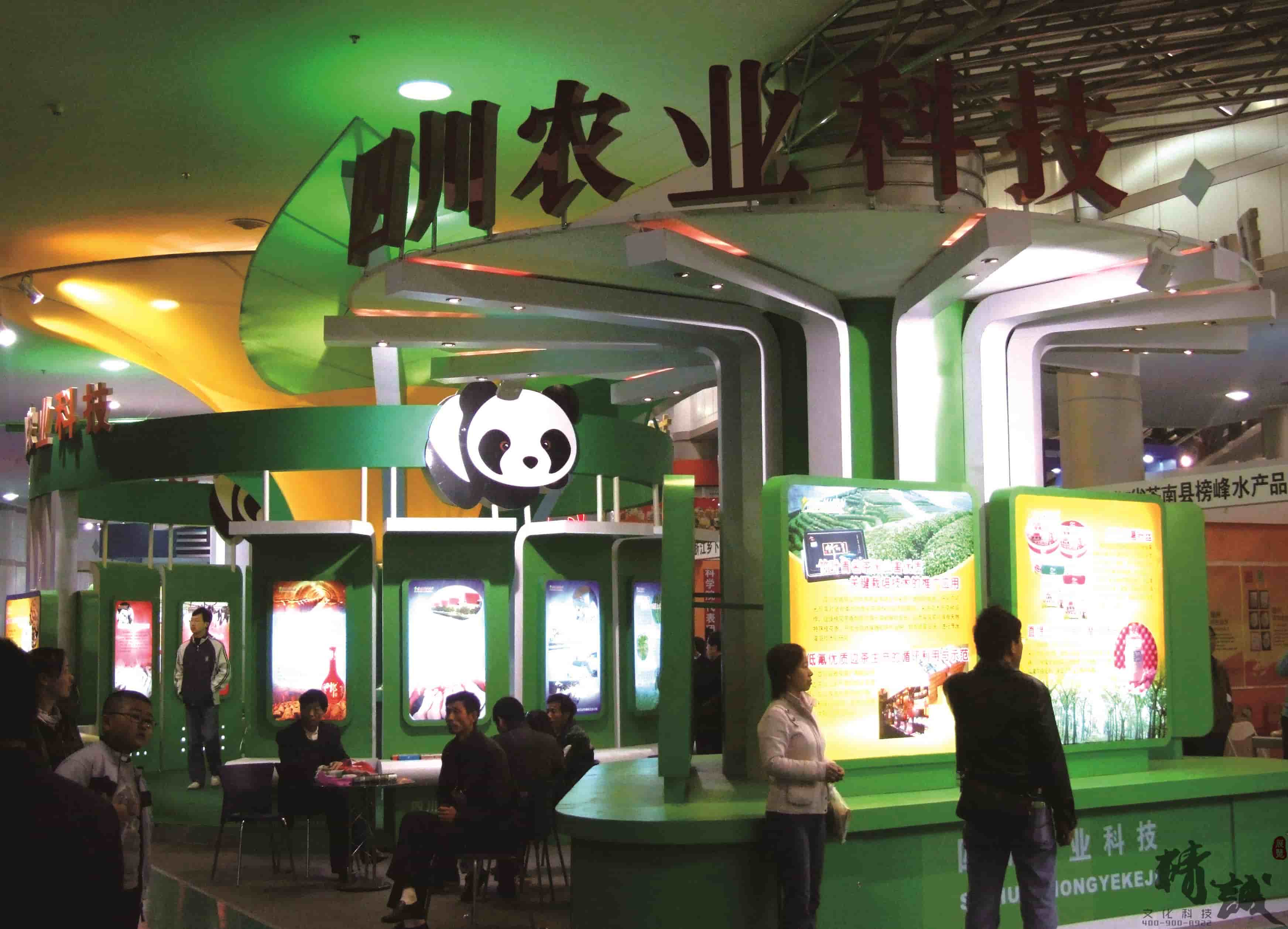 展位設(shè)計(jì)以綠色為主色,體現(xiàn)出四川綠色生態(tài)的現(xiàn)代農(nóng)業(yè);恰當(dāng)?shù)恼古_設(shè)計(jì),便于特色產(chǎn)品的展示;“國寶”熊貓雕刻畫裝飾,使得展位賦予了活潑與動態(tài)感。整個(gè)展位突顯了四川的綠色、生態(tài)。