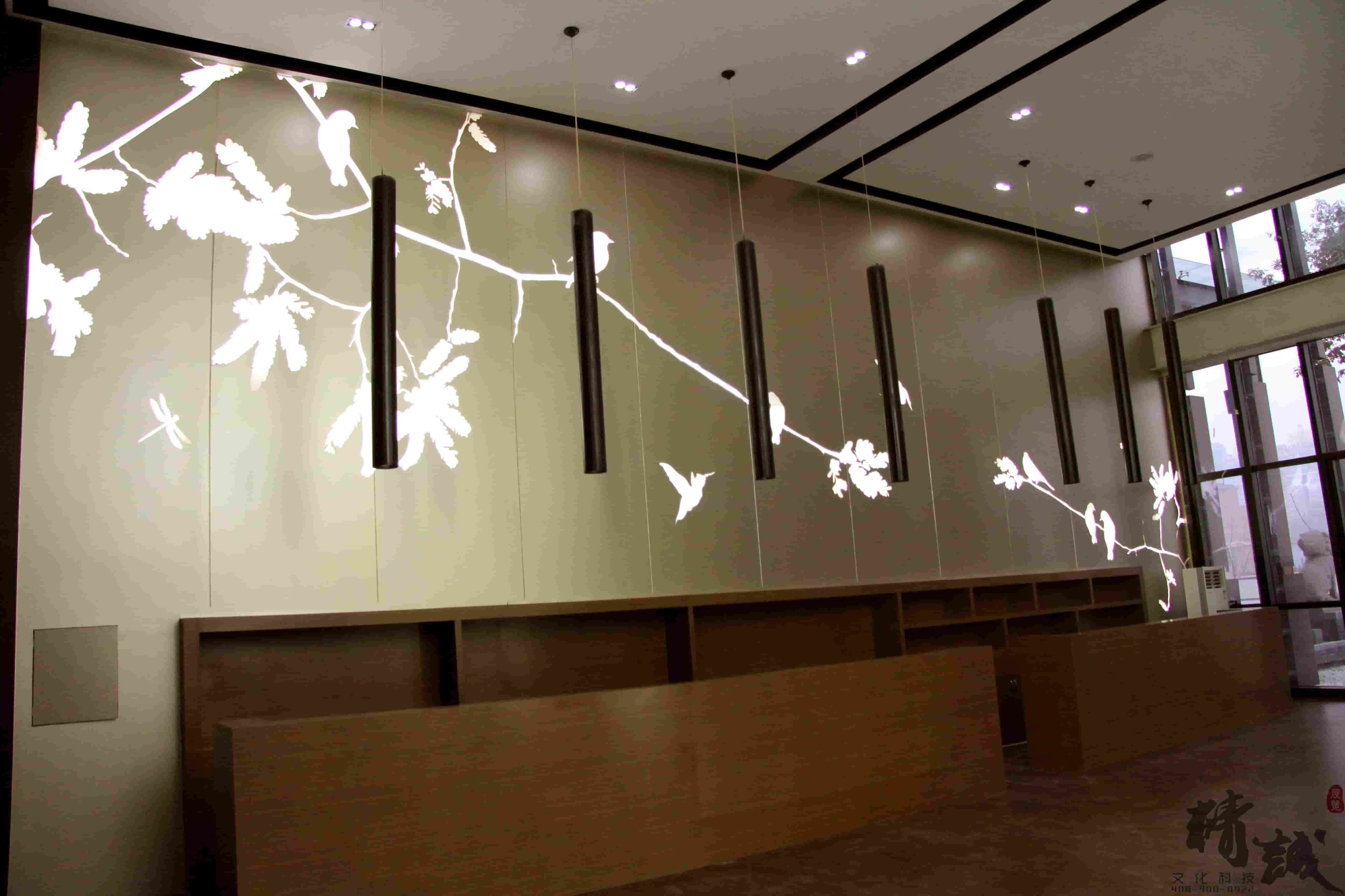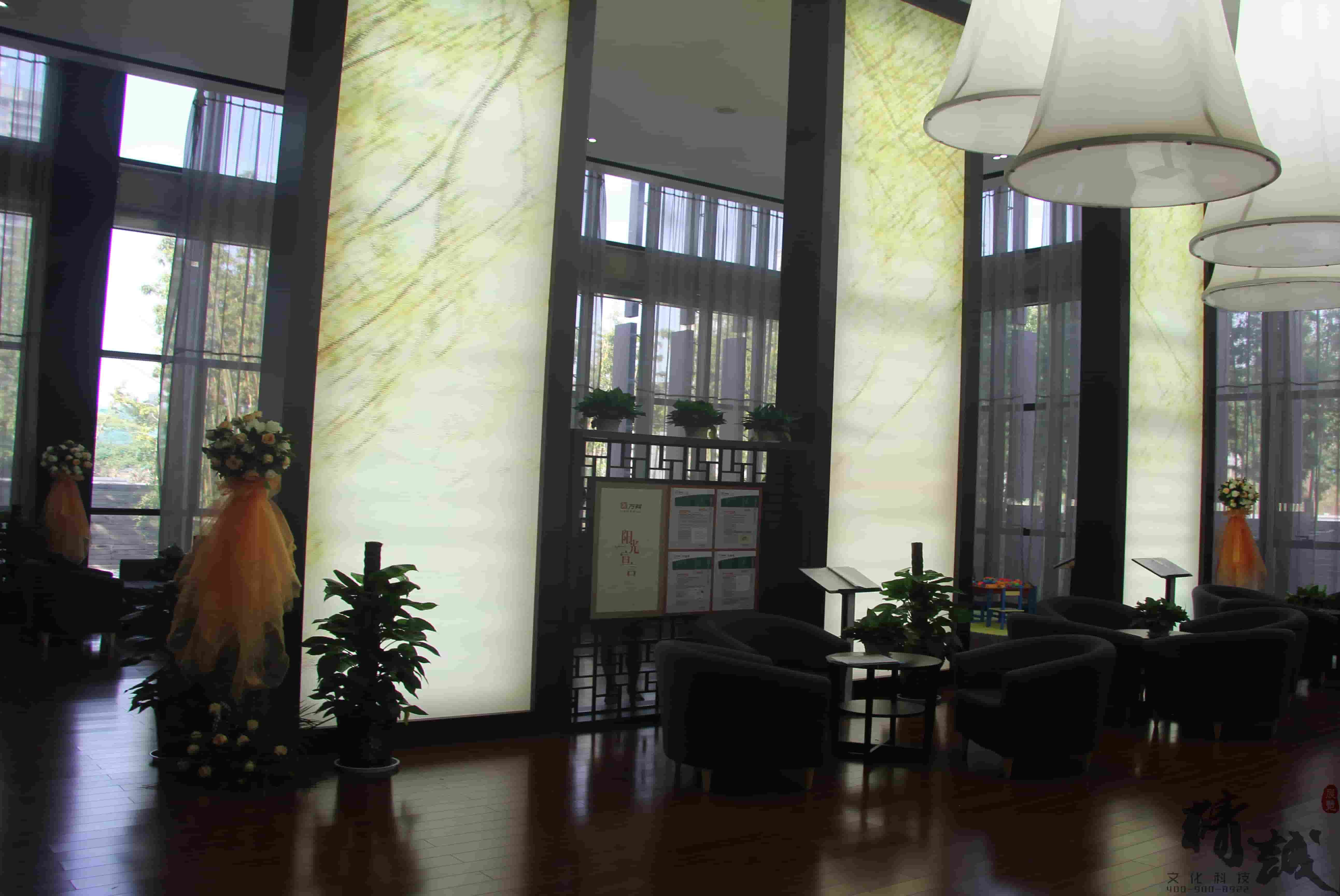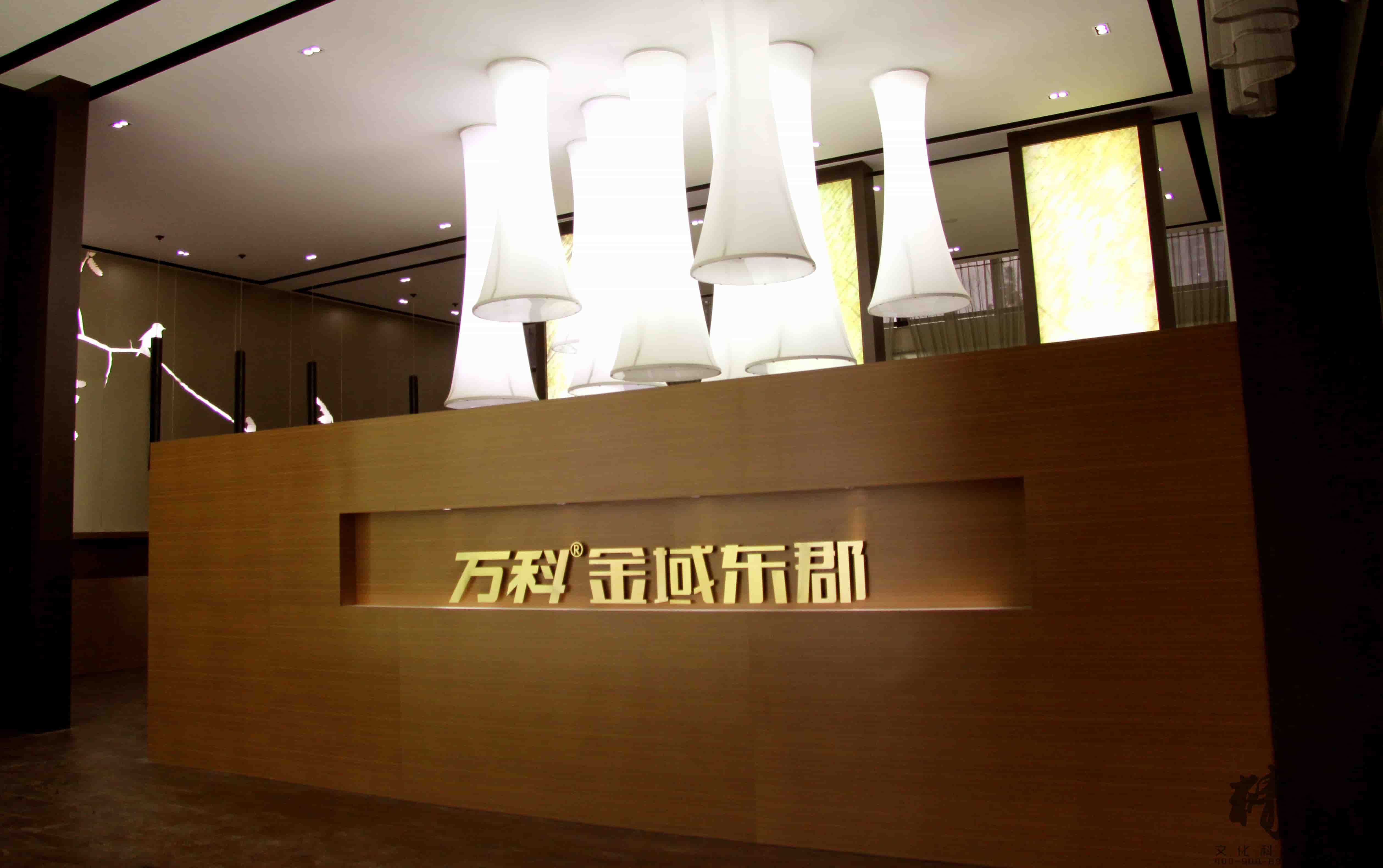 對于萬科金域東郡的裝飾裝修設(shè)計(jì)整個(gè)展廳色調(diào)以穩(wěn)重的棕色為主,用適當(dāng)?shù)慕鹕鳛辄c(diǎn)綴,顯得整個(gè)展廳高端、大氣。大廳頂部懸掛的創(chuàng)意燈飾和墻面花語林鳥的燈光修飾,則為展廳帶來一絲清幽的新意,猶如清風(fēng)拂面。