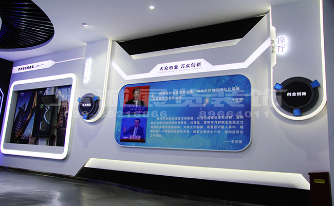 序廳以“大眾創(chuàng)業(yè) 萬(wàn)眾創(chuàng)新”的理念為出發(fā)點(diǎn),提取“創(chuàng)新、創(chuàng)業(yè)”為空間設(shè)計(jì)的設(shè)計(jì)理念,展示國(guó)家政策、社會(huì)發(fā)展、學(xué)生就業(yè)、科技創(chuàng)新等方面內(nèi)容,更好地實(shí)現(xiàn)人們的精神追求和自身價(jià)值。